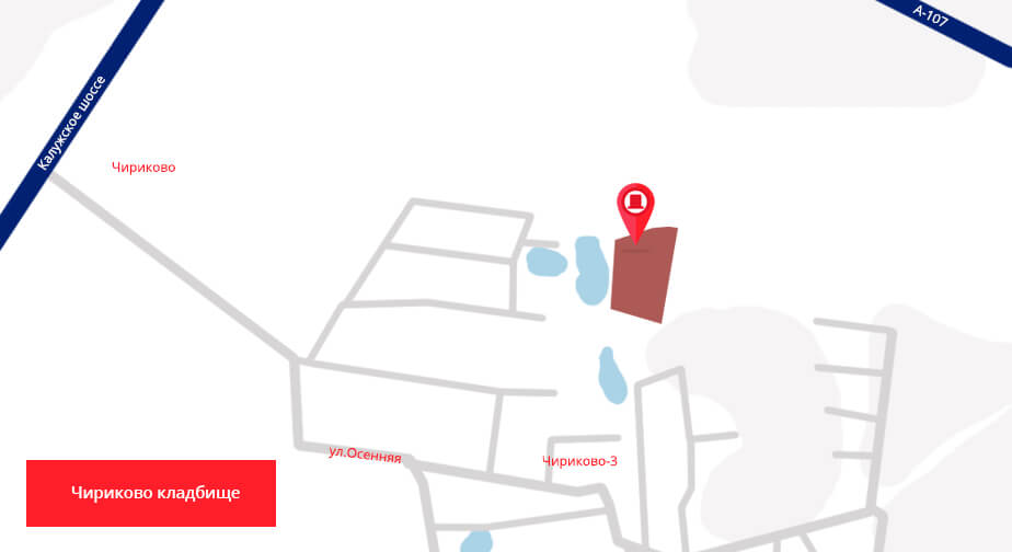 с МКАД на Калужское шоссе, через 30 км, у д. Чириково вправо, на ул. Осеннюю, затем, у правления СНТ «Чириково-2»» круто влево, к кладбищу.