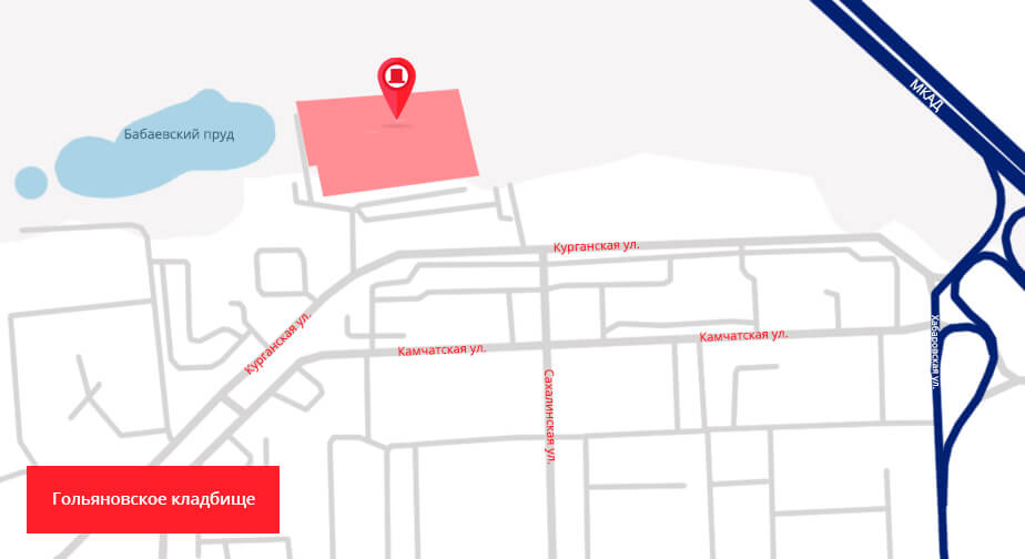 С МКАД (102-й км, внутренняя сторона) на ул. Хабаровскую, затем вправо, на ул. Курганскую, через 780 м круто вправо, к Гольяновскому кладбищу.