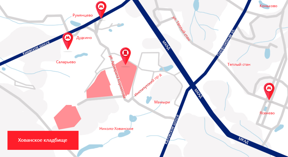 с МКАД на Киевское шоссе, через 1,3 км влево, на ул. Адмирала Корнилова, к Хованскому кладбищу.