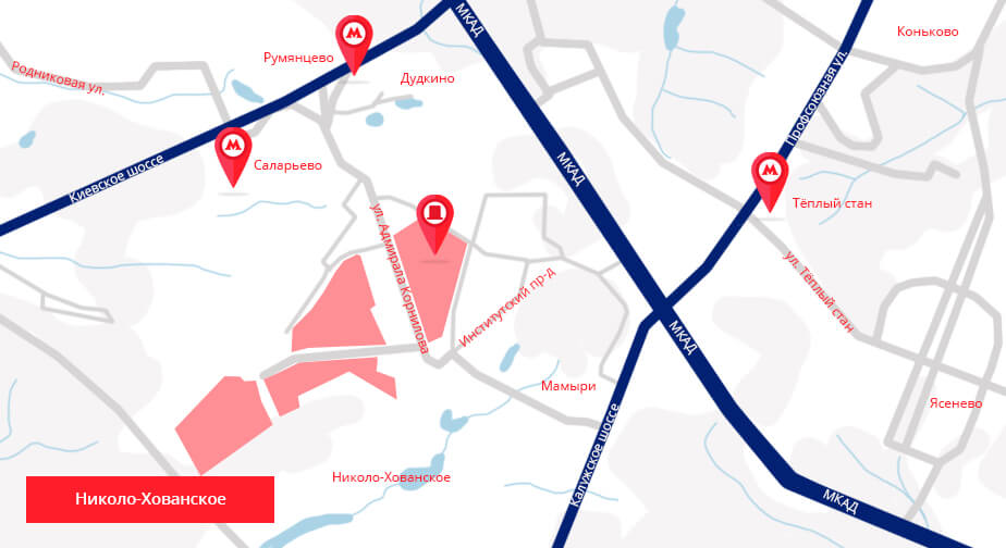с МКАД на Киевское шоссе, через 1,3 км влево, на ул. Адмирала Корнилова, к Николо-Хованскому кладбищу.