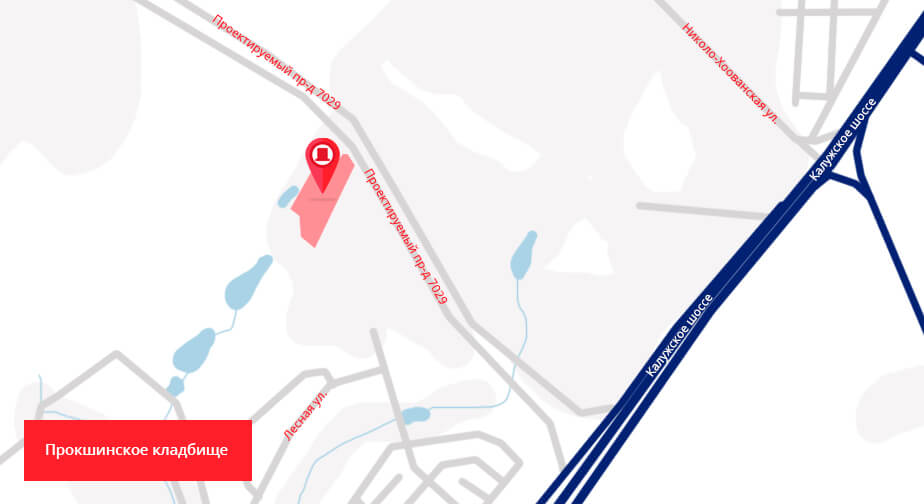 от ст. метро «Прокшино» пройти ко входу на Прокшинское кладбище 1 км вдоль Проектируемого проезда № 7029;
