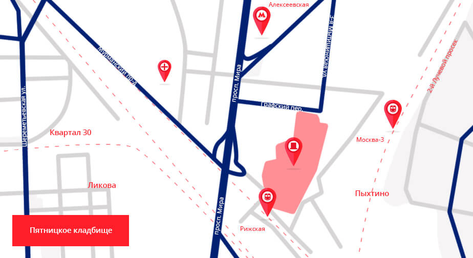 К похоронам, в поминальные и памятные дни родным и близким покойных необходимо прибыть в некрополь. Актуальные сведения о том, как доехать до Пятницкого кладбища по оптимальным маршрутам, приведены ниже.