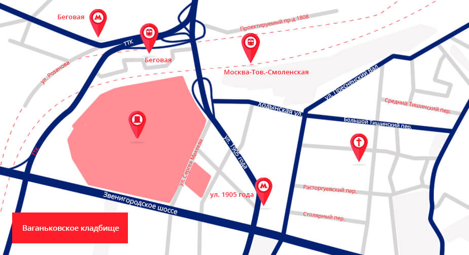 Адрес колумбария Ваганьковского кладбища: ул. С. Макеева, владение 15.