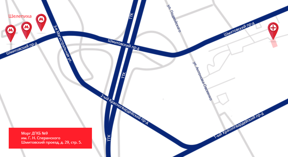 От ст. метро «Шелепиха» автобусами №№ 4, 69, 152, 328, 869, с 43 или троллейбусами №№ 54,66 подъехать до остановки «Шмимтовский проезд – Детская больница» и пройти к моргу 200 м.