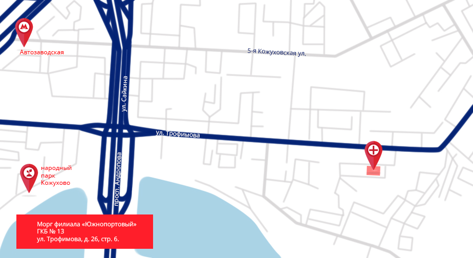 От ст. метрополитена «Автозаводская» автобусом № 193 проехать 2 остановки до «13-й городской больницы» и пройти 320 м к моргу.