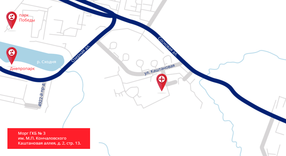 От ст. метро «Ховрино» на автобусе № 400э подъехать до остановки «Ведогонь театр», затем на автобусе №19 доехать до остановки «Горбольница» (5 ост.) и по 4923-му проезду пройти к моргу 170 м.