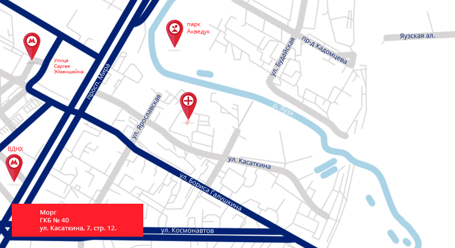 От ст. метрополитена «ВДНХ» пройти к моргу 1,6 км пешком или на автобусах №№ 244, 375, 544 подъехать до «Улицы Бориса Галушкина» и пройти к моргу 800 м.