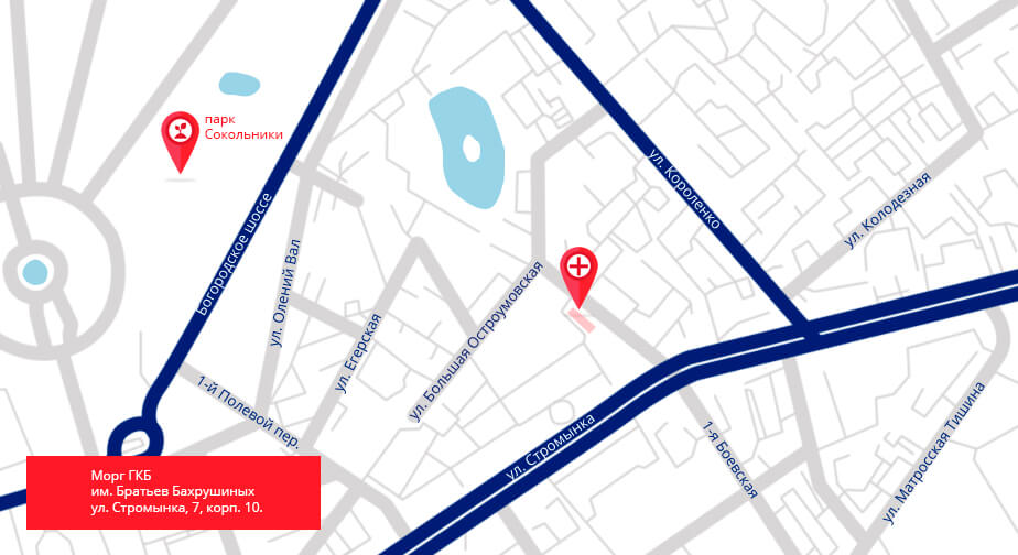От ст. метрополитена «Сокольники)» пройти вдоль ул. Стромынка 500 м к моргу ГКБ № 5.