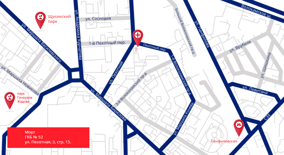 Адрес морга ГКБ № 52: ул. Пехотная, 3, стр. 15.