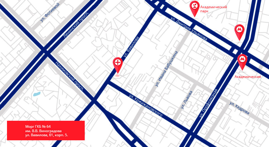 От ст. метро «Профсоюзная» пройти 1,3 км к моргу ГКБ № 64 или на автобусах №№ 67. 67к, 130, 487, 457, 845, 908, троллейбусе № 49 подъехать до «Черёмушкинского рынка» и пройти 600 м к моргу