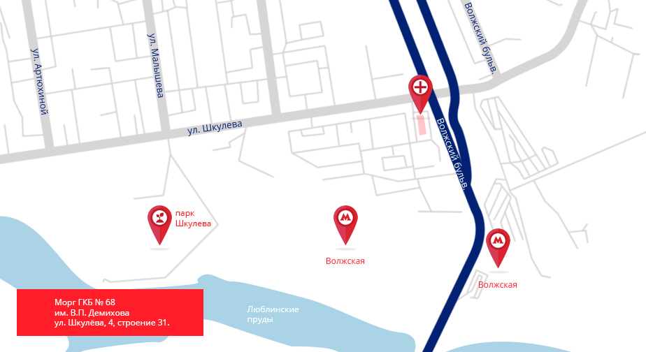 - С МКАД на Волгоградский просп., через 4,3 км влево, на ул. Маршала Чуйкова, через 1,6 км влево, на Волжский бульвар, затем вправо, к моргу ГКБ № 68.