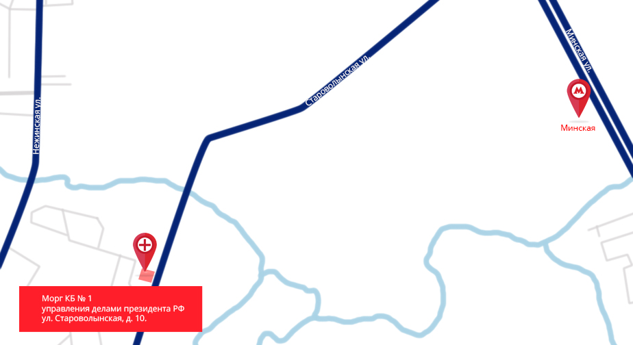 От ст. метро «Минская» пройти к моргу пешком 1,5 км или автобусом № 185 подъехать до «Больницы № 1» и пройти к моргу 100 метров.