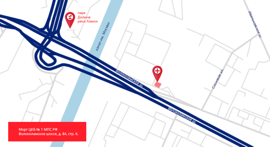 От ст. метрополитена «Тушинская» автобусами №№ 456, 88, 904, 904к подъехать к «Больнице МПС» и пройти к зданию морга.