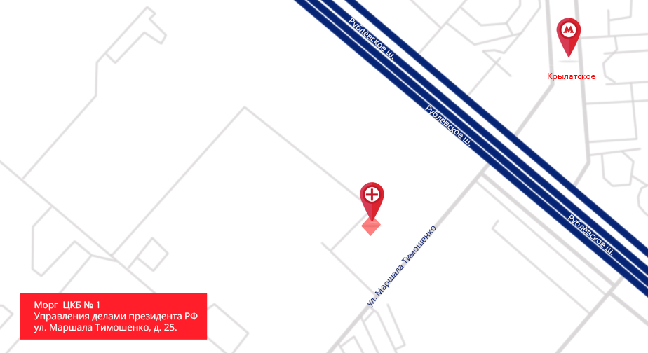 С МКАД на Рублёвское ш., через 2,2 км направо, по ул. Маршала Тимошенко, затем вправо, к зданию морга ЦКБ № 1 УДП.